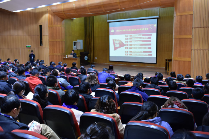 11月16日下午,城乡建设学院、图书馆、体工部共同邀请18luck新利手机版iso 十九大宣讲团成员、马克思主义学院副院长郭跃军教授在东校区二教报告厅做“学习十九大精神”专题辅导报告,城乡建设学院、图书馆、体工部全体领导班子成员、师生党员共380余人参加了报告会。