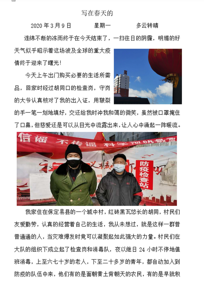 活动发布后,各班团支部积极响应,同学们踊跃参加,共收到日记近70篇。同学们从第一人视角,讲述了在疫情防控期间个人经历和感受。有的同学叙述了自己的社区、乡镇志愿服务经历;有的同学讲述了自己身边发生的抗疫感人故事,还有的同学分享了自己响应国家号召,居家生活的感受。这些日记,语言平实,情感真挚,体现了当代青年对雷锋精神的理解和践行。