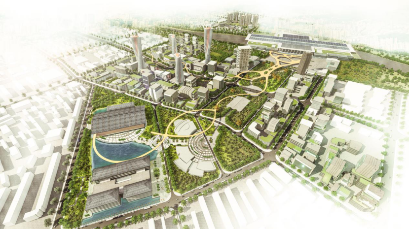 由丰台站向南北两个方向延伸支持步行的绿色开放空间,缝合被铁路割裂的南北交通,围绕车站和轨道交通站点布置商业群体,结合周边产业群打造片区特色未来交通产业,围绕产业园区形成科创邻里中心,为园区提供综合性多元服务。结合保留建筑创造玩儿聚文化园区。串联街头绿地形成景观休闲走廊和创新交流走廊。