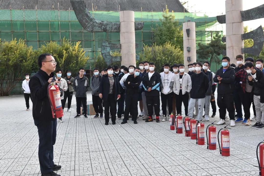 讲座结束后,全体师生到达一教东广场集合。消防科工作人员现场演示二氧化碳灭火器、干粉灭火器的使用方法及注意事项,并指导在场师生按照“提、拔、握、压”的灭火操作要领实际演练。