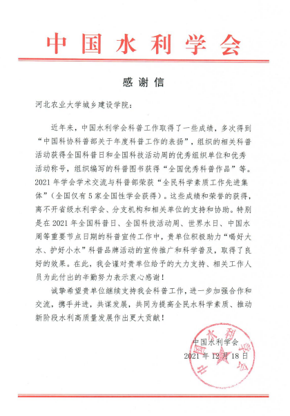 近日,中国水利学会向学院发来感谢信,对学院在2021年全国科普日、全国科技活动周、世界水日、中国水周等重要时间节点的科普宣传工作给予肯定和感谢。