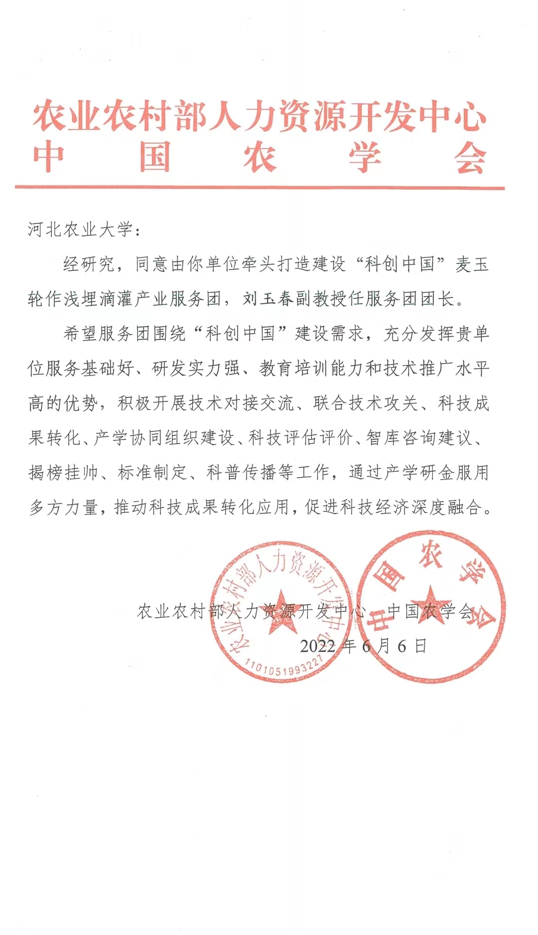 近日,农业农村部人力资源开发中心和中国农学会联合发函,批准学院牵头打造建设“科创中国”麦玉轮作浅埋滴灌产业服务团。该服务团是由我校联合河北省和北京多家科研院所和多家企业共同组建,包括农学、农田水利、水资源、智慧农业、机电等专业的行业管理、技术、企业专家共计30多人,学院刘玉春副教授任服务团团长。近年来,该团队相关人员同我校的太行山农业创新驿站保定硕丰农产股份有限公司一起联合攻关,针对华北平原的粮食安全、水资源短缺问题创建了适合华北平原推广应用的麦玉轮作浅埋滴灌技术体系,2020和2021年在河北省推广应用取得了“二增三省”的显著成效,为河北省乃至华北平原的小麦玉米节水高质高效生产创新性的探索了一种新的种植模式,为服务团的建立和建设奠定了良好的基础。