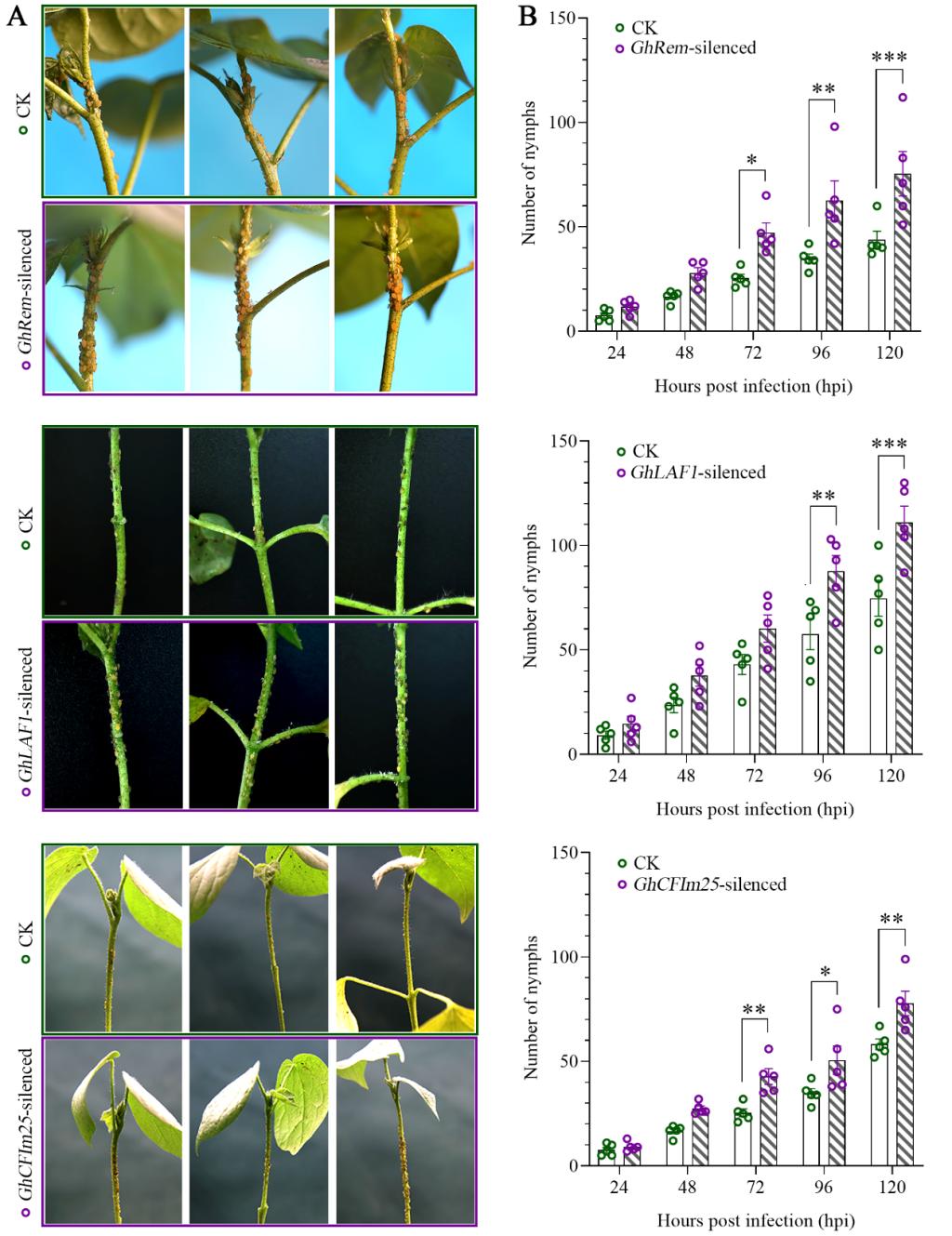 图2沉默GhRem、GhLAF1和GhCFIm25显著增加棉蚜繁殖量