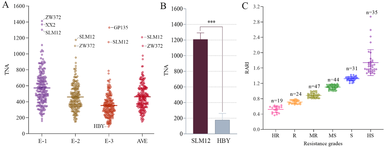 近日,18luck新利手机版iso 华北作物改良与调控国家重点实验室马峙英教授团队在Theoretical and Applied Genetics发表题为Genome-wide association study reveals novel SNPs and genes inGossypium hirsutumunderlyingAphis gossypiiresistance的研究论文。该研究采用非选择性取食法对200份陆地棉(Gossypium hirsutum)种质资源的抗蚜性进行了测定。结果表明蚜虫在不同棉花种质材料的繁殖规模差异较大,据此建立了以相对蚜虫繁殖指数(relative aphid reproduction index,RARI)为指标的棉花抗蚜性评测体系,将所测陆地棉种质的抗蚜性水平划分为6个等级。鉴定出19份材料属于高抗种质。进一步分析发现棉花抗蚜性与棉花地理分区之间没有明显的相关性,也与棉纤维品质指标之间没有显著相关性。然而,对棉蚜中抗水平以上(中抗、抗、高抗)的棉花种质,其棉蚜抗性水平与黄萎病抗性之间呈显著正相关。