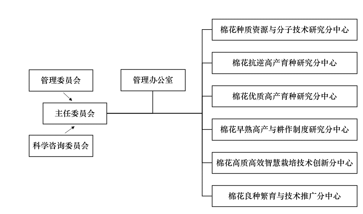 管理委员会为最高管理机构,科学咨询委员会为最高科技咨询决策机构,主任委员会为执行机构,下设管理办公室,负责日常运行管理工作。按照协同创新目标和任务,建立棉花种质资源与分子技术研究分中心、棉花抗逆高产育种研究分中心、棉花优质高产育种研究分中心、棉花早熟高产与耕作制度研究分中心、棉花高质高效智慧栽培技术创新分中心、棉花良种繁育与技术推广分中心等6个创新分中心。以“绿色、优质、高产、高效、轻简、智能”为主题开展棉花产业技术创新,管理部门、协同单位、专家团队、农技人员、植棉合作社、种棉大户等,协同建设产业技术示范基地,引领产业发展。