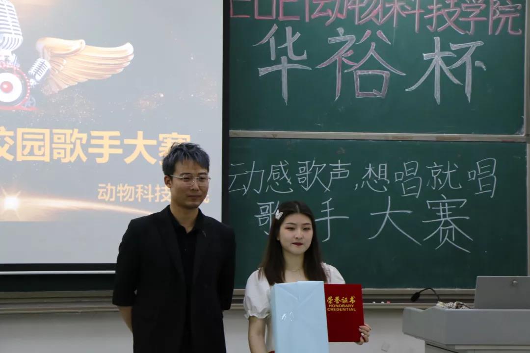 经过近一个月的初赛、复赛,13名选手登上了决赛的舞台。本次比赛共分为独唱和帮唱两个环节。独唱中,白奇卉带来的歌曲《一路向北》拉开了比赛的序幕,毋天姣演唱的《red》将爱诠释为充满活力的红色,谭愿演唱的《赤伶》展现了战争年代的人民对祖国的赤诚忠心……。他们用嘹亮动情的歌声唱出了新时代的青春韵律,充分展现了个人风采。帮唱环节中,参赛选手和助唱嘉宾共同完成对唱,别出心裁的演唱形式、精心设计的舞台表演、完美的和音、默契的配合,给观众留下了深刻的印象。全体参赛选手合唱了歌曲《国家》,既展示了才艺风采,也表达了青年学子对祖国和谐、稳定、繁荣、富强的深深祝福。经过近两小时的激烈角逐,动科1906班毋天姣荣获一等奖和最佳人气奖,草业2001班谭愿和动科2002班张栋梁荣获二等奖,动科1904班石一龙、草业2001班李斯淳和动科2005班陈佳瑜荣获三等奖,动科2001班和2002班荣获最佳组织奖,草业1901班杨佳佳荣获最佳帮唱奖。此次比赛为同学们提供了一个展示自我风采的舞台,丰富了同学们的课余生活,营造了积极向上的校园文化气氛,展现了动科学子昂扬向上的青春活力。