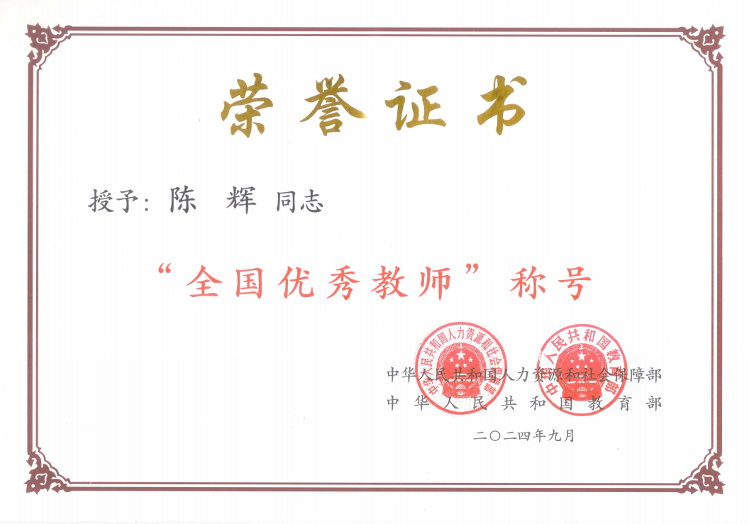 近日,人力资源和社会保障部、教育部发文,公布了2024年全国教育系统先进个人评选名单,我院教师陈辉被授予“全国优秀教师”称号。