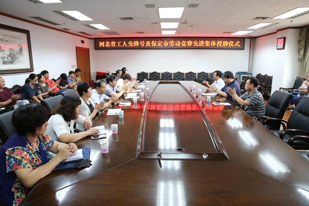 6月19日下午,“河北省工人先锋号”和保定市“劳动竞赛先进集体”授牌仪式在综合楼十一楼会议室举行。市总工会正县级调研员、党组成员文霖同志为获奖单位颁发了证书和奖牌。校党委常委、组织部部长陈林元出席授牌仪式。