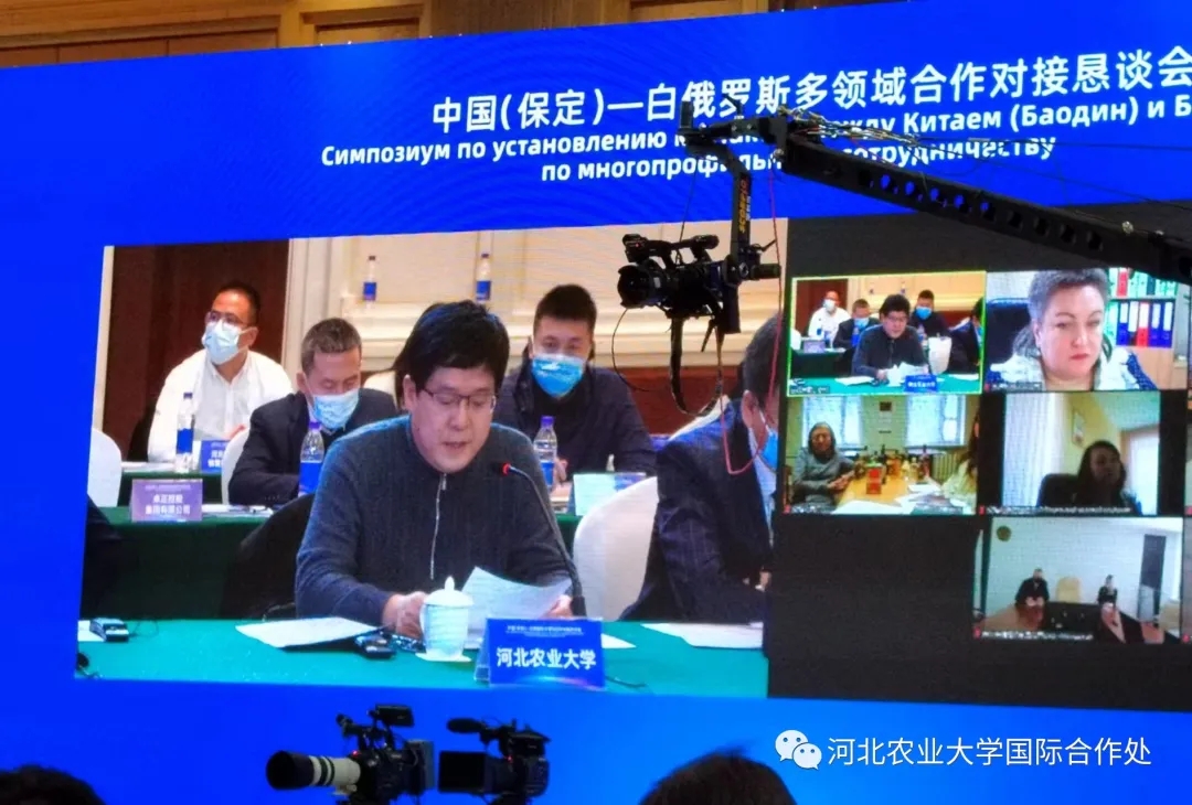 2022年1月25日,中国(保定)—白俄罗斯多领域合作对接恳谈会在保定举行,会议由保定市人民政府和白俄罗斯共和国驻华大使馆主办,保定市人民政府外事办公室、保定市商务局、泰通国际运输有限公司共同承办,采取线上+线下的方式,分为保定、北京、石家庄和白俄罗斯4个分会场。保定市人民政府市长闫继红、白俄罗斯戈梅利州执行委员会副主席康尤辛科∙安德烈∙瓦西里耶维奇、白俄罗斯驻华大使先科∙尤里、白俄罗斯戈梅利州斯韦特洛戈尔斯克区政府及有关部门和企业负责人,省外办党组成员、省友协副会长吕晓梅,保定市直相关部门、相关县(市、区),驻保高校代表,以及30余家重点商贸物流企业代表出席会议。副市长杨伟坤主持会议。我校国际合作处处长、国际教育交流学院院长、科学技术研究院院长赵建军代表我校参加会议。