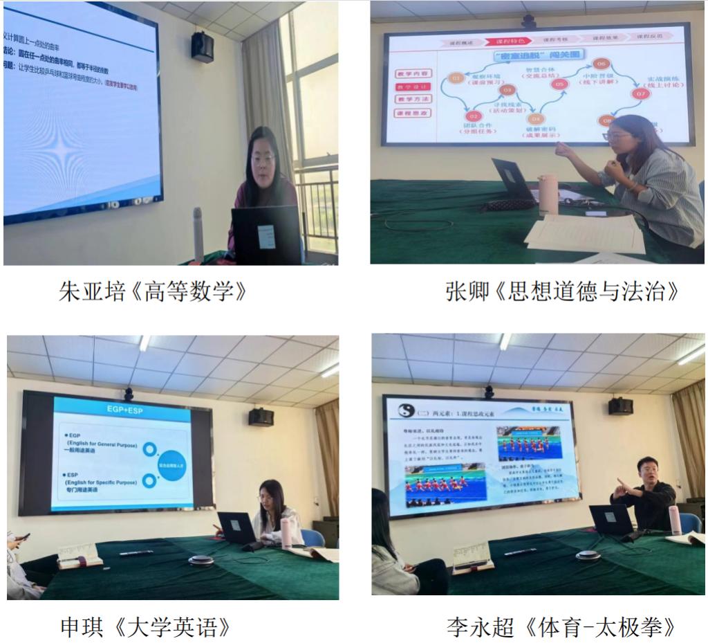 会上,四个教研室教师代表分别通过说课的形式进行了精彩的汇报。数理教研室朱亚培从教学分析、总体设计、教学实施阐述了《高等数学》课程,突出以学生为主体,教师为主导的教学理念。思政教研室张卿结合自身课程建设过程,从课程概述、课程特色、课程考核、课程效果、课程反思等方面分享了她在课程建设中的实践经验和心得体会。英语教研室申琪陈述了《大学英语》EGP与ESP融合教学探索,结合实际情况分享了“浸入式英语”教学理念。体育教研室李永超陈述了《体育-太极拳》课程的教学实践新思路,同时巧妙融入体育课程思政元素。