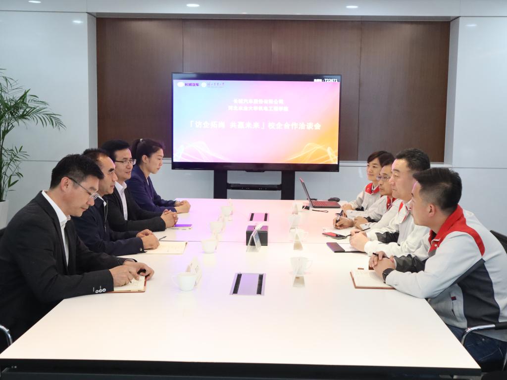 在“访企拓岗、共赢未来”校企合作洽谈会上,双方领导一致表示,未来将继续充分利用长城汽车学院、国家级大学生校外实践教育基地、教育部供需对接就业育人项目等合作平台,创新本硕人才联合培养模式,通过真实的工程场景和工程问题,提升学生的实践能力和综合素质;充分发挥校企距离相近、专业对口、资源互补的天然优势,深入拓展技术交流、科研攻关、人才引进、党团共建等合作领域,共同推动中国汽车产业的创新发展。