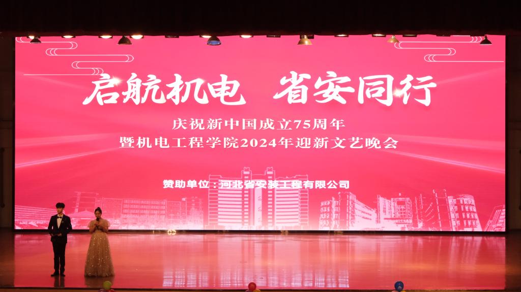 10月13日,机电工程学院在综合楼礼堂举办“启航机电 省安同行”庆祝新中国成立75周年暨学院2024年迎新文艺晚会,学院党委副书记副院长周永杰、副院长郝建军,河北省安装工程有限公司人力资源部部长史新社出席活动,学院校友代表、教师代表及900余名本科生、研究生新生参加活动。