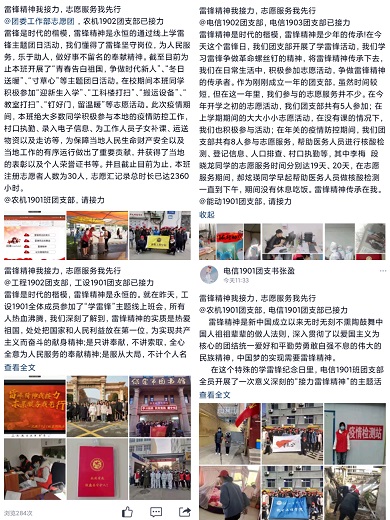活动以“学雷锋”线上主题团日活动以及QQ空间发文接力的形式展开,各团支部集中学习了雷锋事迹和雷锋精神,广大团员积极分享自己的感悟,由团支部书记在QQ空间梳理通报本支部“学雷锋”活动情况和支部志愿服务工作开展情况。