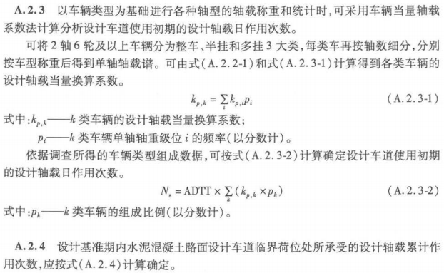 A.2.2各类车辆按轴型称重和统计时,可采用以轴型为基础的轴载当量换算系数法计算分析设计车道使用初期的设计轴载日作用次数随机统计3000轮及以上车辆中单轴、双联轴和三联轴等不同轴型出现的单轴次数,并分别称取其单轴轴重可按单轴轴重级位统计整理后得到轴载谱,并按式(A.2 2-1)计算确定不同轴重级位的设计轴载当量换算系数