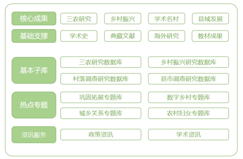 数据库以出版社“三农”问题和城乡关系研究成果为基础,探讨全面推进乡村振兴议题和工作实践,聚焦乡村研究的学术传统与国际经验,整合典型村落和中小城市大型调研项目的研究成果和珍稀史料档案,以及国外乡村建设经验。