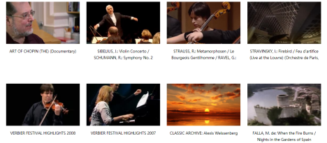 汇集了歌剧、舞蹈、音乐会、纪录片、爵士、音乐之旅、讲解与大师课、艺术、戏剧、比赛等近现代1000多部共3000多小时的优秀音乐视频作品。既有巴赫、贝多芬、莫扎特等大师宏伟巨作的现场音乐会,亦有帕瓦罗蒂、多明戈等歌唱家的天籁之音,以及中国当代音乐家谭盾、陈其钢等的经典作品,阿巴多、阿格里奇等现代音乐大师访谈,伯恩斯坦的现场排练课。在欣赏经典芭蕾舞剧的同时,还可领略罗马、莫斯科、伦敦、北京等中外名城的音乐风光,感受不同地域风情,享受完美视听盛宴。