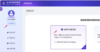 操作步骤:打开https://aiplus.cnki.net登录已注册的知网个人账号,点击右上角账号进入个人中心--我的订单--关联机构,选择AI助手功能权益。