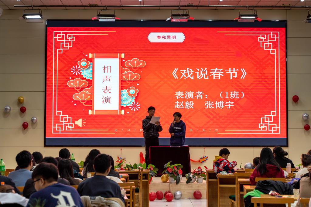 一元复始开新宇,万象更新起宏图。以“研途有你,一路相伴”为主题的元旦晚会在《食安辞旧迎新》先导片中拉开帷幕,全场花团锦簇、姹紫嫣红,奏响了新年联欢的华美乐章。晚会共分为“春和景明”“炎炎夏日”“丹枫迎秋”“瑞雪纷飞”四个篇章。节目内容包括了舞蹈、歌曲、小品、相声、武术等多种形式,内容丰富。一首合唱《爱》,以饱满的热情,为现场增添了节日温情气氛;现代舞《Love Dive》和古典舞《醉》分别展现了学生的活力和才华;相声《戏说春晚》更是赢得了现场观众的阵阵掌声和笑声;设计巧妙的互动游戏吸引学生积极参与,增进了同学间的感情与协作能力。精彩纷呈的节目在观众们激情的欢呼声中依次登场,豪情满怀、振奋人心、高潮迭起,最后伴随一曲心旷神怡的《难忘今宵》晚会圆满落下帷幕。