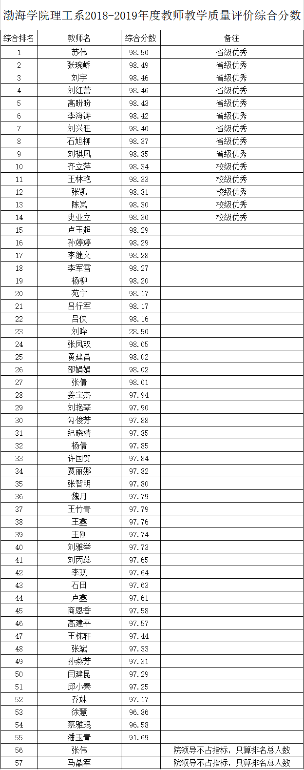 渤海学院理工系2018-2019年度教师教学质量评价排名