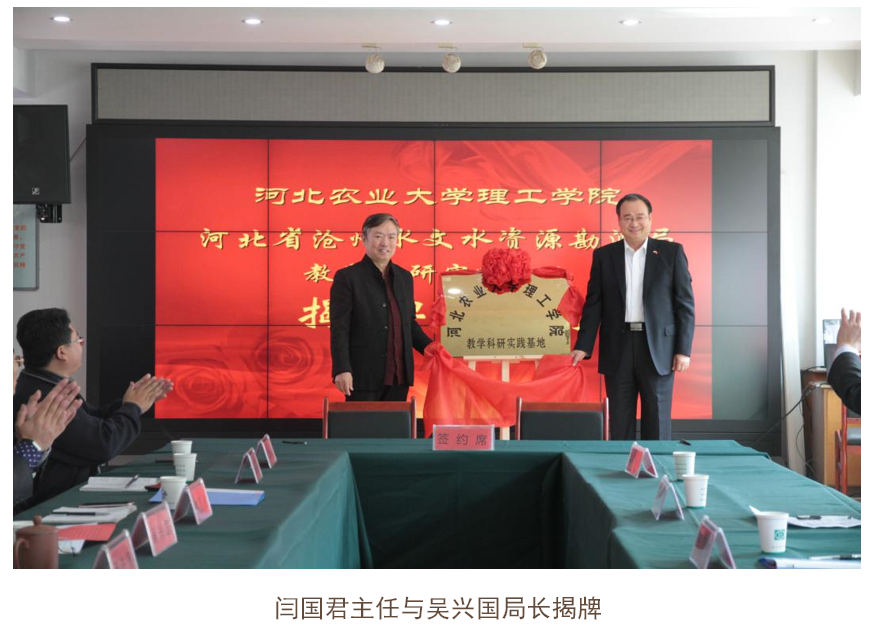 活动由水文水资源勘测局张进旗书记主持,闫国君主任和吴兴国局长分别做了重要讲话,随后进行了签约和揭牌仪式。仪式过后,双方在会议室进行了深入的座谈和交流,内容主要是围绕教学科研、高新技术开发、水资源评价研究、水生态修复等领域展开。