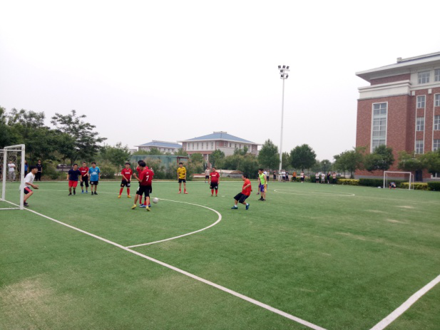 绿荫点亮前路,激情告别青春。在参赛双方进行了充分的热身准备后,比赛正式开始。上半场一开始两支参赛队就展开了猛烈的进攻,双方队员毫不示弱,展现出各自熟练的脚法。在速度的优势下,学生队首先获得一分。双方默契的配合、缜密的队形部署使得比赛随后进入白热化。联合防守,巧妙抢球,奋力射门,无不使台下的观众连连欢呼。中场双方队伍进行了简单休息并对部署进行了调整。休息过后下半场开始,教师队开始了激烈的反攻,凭借着紧密的配合和精湛的球技最终以2:1赢得了比赛。