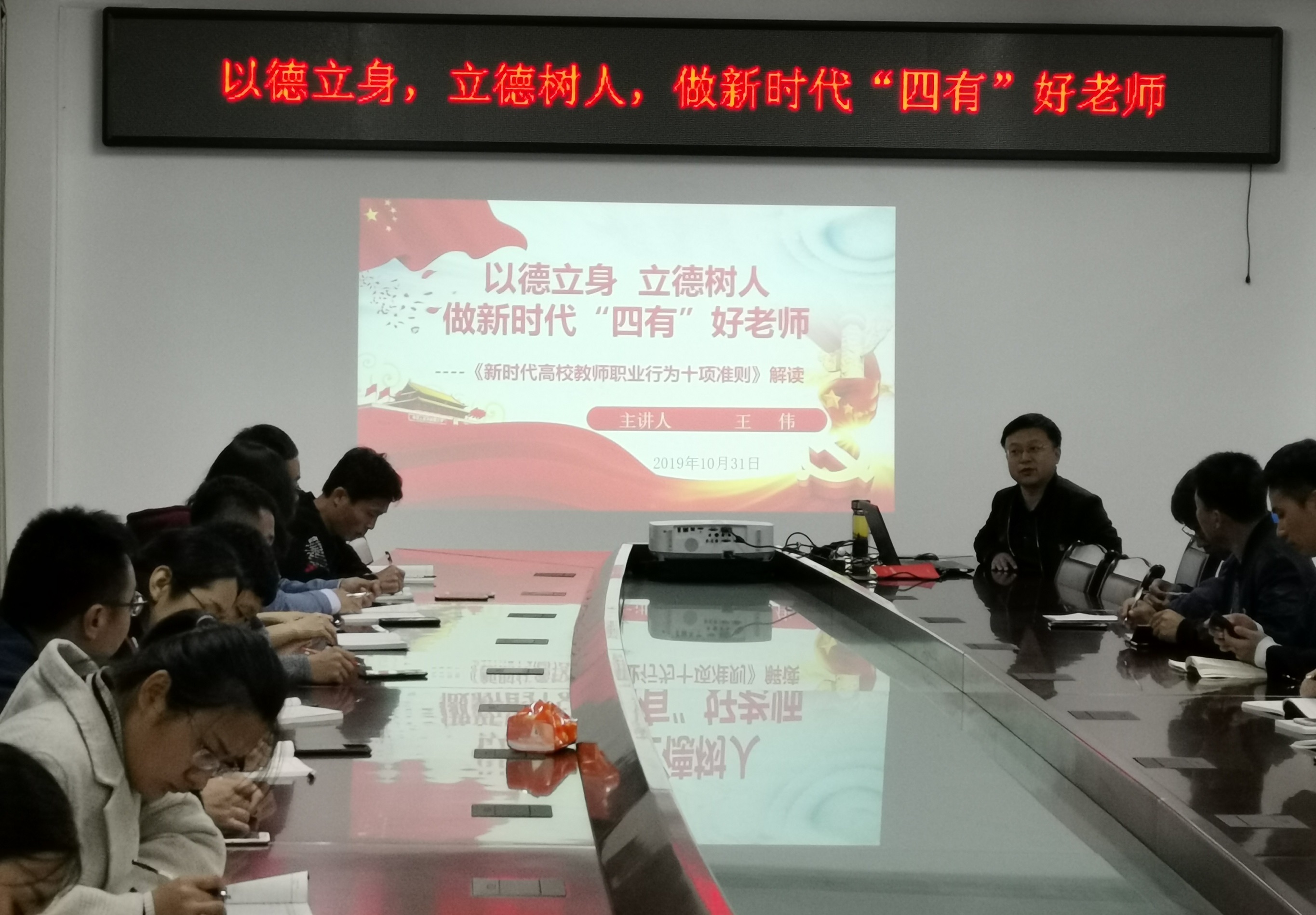 根据学校“不忘初心、牢记使命”主题教育安排和渤海学院党委的工作部署,10月31日晚,在崇德楼0916会议室,理工系党总支书记王伟以理工系师德师风建设为主题,结合前期座谈调研的成果,向理工系全体教职工讲授了专题党课——《以德立身,立德树人,做新时代“四有”好老师》。