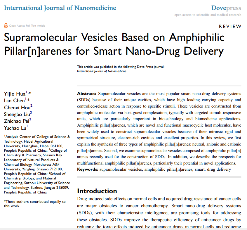 8月10日,理工系食品质量与安全专业2017级本科生滑艺洁同学在卢玉超老师指导下,以第一作者身份在国际期刊International Journal of Nanomedicine(中科院2区,影响因子为5.115)上在线发表题为“Supramolecular vesicles based on amphiphilic pillar[n]arenes for smart nano-drug delivery”的综述论文。该工作得到18luck新利手机版iso