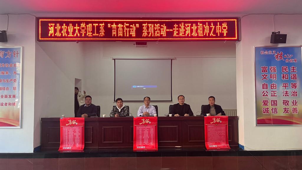 为了更好的开展高考招生宣传工作,提高学校社会影响力,11月19日,理工系开展“育苗系列活动”之走进河北涞水祖冲之中学。本次活动由理工系水利水电专业系主任苏伟博士带队,渤海学院副处级辅导员王洪东、就业指导中心主任耿林、理工系招生办公室李俊杰及祖冲之中学优秀校友参加活动。