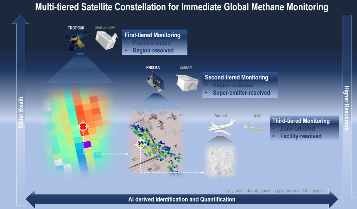 甲烷是全球最重要的温室气体之一,其温室效应是二氧化碳的80倍(二十年内)。全球100多个国家共同签署了《全球甲烷承诺》,一致开展全球甲烷减排。因此,落实全球甲烷监测是推动《全球甲烷承诺》的基本前提,而开展卫星监测几乎是唯一方法。然而,时至今日,全球仍然缺乏兼顾大尺度和高精度的卫星甲烷监测。
