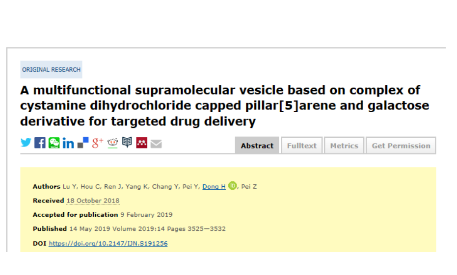 5月14日,我系卢玉超博士与西北农林科技大学裴志超教授团队合作的又一研究成果,在药学学科国际知名期刊《国际纳米医药》(International Journal of Nanomedicine)发表,其题为“A multifunctional supramolecular vesicle based on complex of cystamine dihydrochloride capped pillar[5]arene and galactose derivative for targeted drug delivery” (Int J Nanomedicine., 2019,14, 3525-3532),卢玉超博士为论文第一作者(中科院JCR分区:2区,IF:4.37)。这是继去年10月底,卢玉超博士成功构建细胞膜和细胞器双靶向纳米药物载体的又一重要成果(卢玉超博士为共同通讯作者, Isr. J. Chem. 2018, 58, 1205-1209 )。