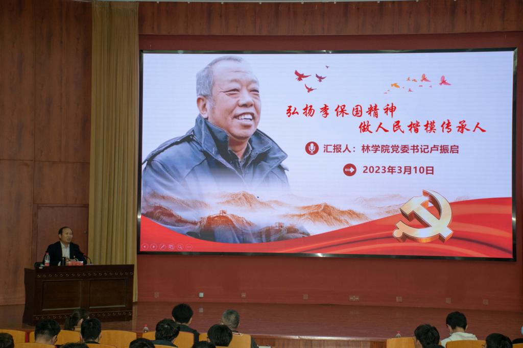 3月10日晚上,林学院在西校区图书馆报告厅举办青春讲堂系列活动之“弘扬李保国精神 做人民楷模传承人”报告会,林学院党委书记卢振启作了《李保国先进事迹及其精神价值》专题报告,全体辅导员、青年教师代表、2022级研究生、本科生共400余人参加了报告会。