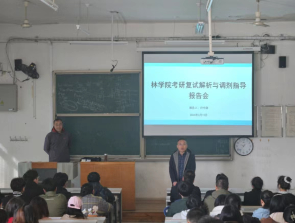 3月12日,2024年研究生入学考试国家分数线予以公布,3月13日林学院在西校区图书馆1205教室专门组织举办研究生入学考试复试解析与调剂指导专题报告会,报告会由学院副院长、博士生导师许中旗主讲,有近150名2024届毕业生参加报告会。