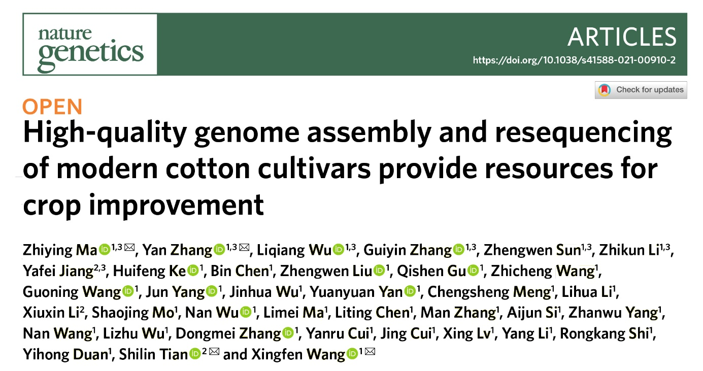 2021年8月9日,Nature Genetics在线发表了我室马峙英教授团队等题为“High-quality genome assembly and resequencing ofmodern cotton cultivars provide resources for crop improvement”研究论文。该研究首次组装了陆、海现代品种高质量基因组,发现上千个棉属新基因,填补了现代棉花品种基因组缺乏的空白;破译了海岛棉、陆地棉结构变异图谱,发现一批影响基因表达的新变异;完成1,081份陆地棉品种资源基因组重测序,探明了陆地棉结构变异的性状遗传效应,发现黄萎病抗性GhNCS新基因,为作物多性状协同改良提供了新的理论依据和资源。