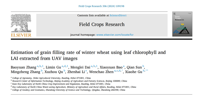 近日,我室作物水肥耦合高效调控创新团队在Field Crops Research(中科院一区Top,IF = 5.80)在线发表了题为“Estimation of grain filling rate of winter wheat using leaf chlorophyll and LAI extracted from UAV images”的研究论文。该研究利用无人机多光谱影像和机器学习算法开发了一种有效估算冬小麦灌浆速率的新方法,并实现了大田尺度空间制图。