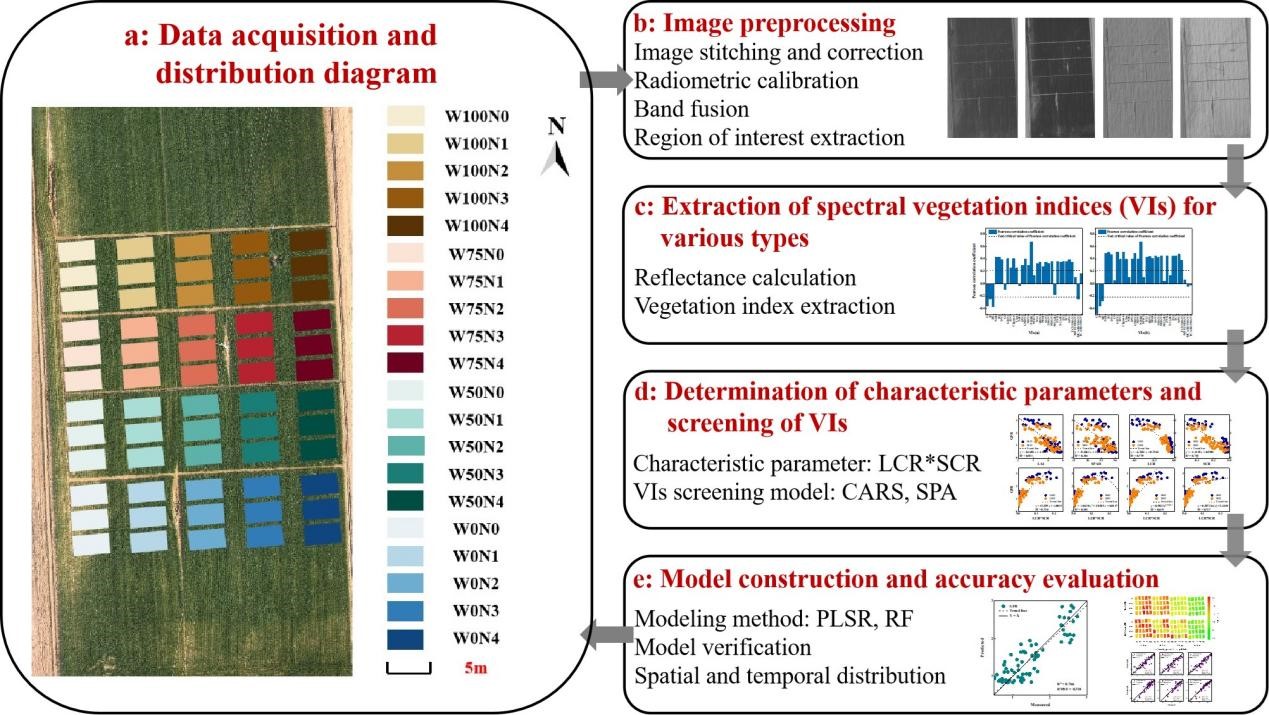 本研究设置水氮互作试验,首先建立了冬小麦GFR与SPAD和LAI之间的定量关系。随后,利用无人机多光谱影像监测灌浆期SPAD和LAI的时间序列动态变化。最后,构建了冬小麦GFR估算模型,并实现了GFR大田尺度空间制图。为了筛选SPAD和LAI的敏感植被指数组合,分别采用了自适应重加权采样和连续投影算法。随后,基于筛选出的敏感植被指数组合,采用偏最小二乘和随机森林算法建立SPAD和LAI估测模型,并将其与全指数组合估测模型进行比较。最后,基于SPAD和LAI与GFR的转换模型估算GFR。