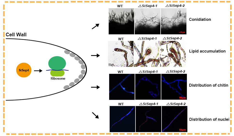 2023年12月,在学术期刊Journal of Agricultural and Food Chemistry(一区Top,IF 6.1)发表了题为“The septin geneStSep4cont-ributes to the pathogenicity ofSetosphaeria turcicaby regulating themorphology, cell wall integrity and pathogenic factor biosynt-hesis”的研究论文。隔膜蛋白Septin是高度保守的GTP结合蛋白家族,被认为是继微管、微丝和中间纤维之后的第四种细胞骨架蛋白。该研究利用基因敲除技术,重点解析了隔膜蛋白基因StSep4如何在玉米大斑病菌生长发育过程中发挥功能,并参与侵染寄主的过程。研究结果表明,StSep4是玉米大斑病菌发育和侵染所必需的,并可能主要通过影响核糖体的合成发挥其调控作用。成果为发现病害防控新策略奠定了理论基础。