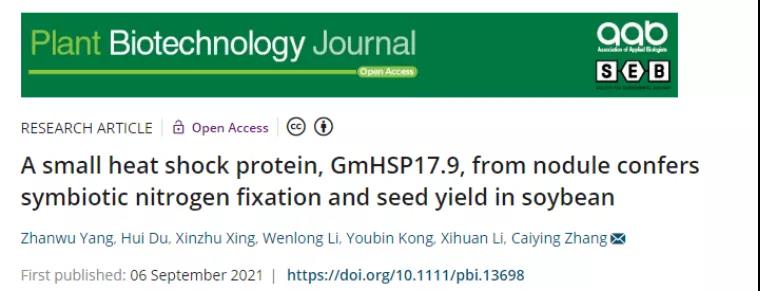 近日,国际高影响力杂志Plant Biotechnology Journal在线发表了我院大豆遗传育种团队题为“A small heat shock protein, GmHSP17.9, from nodule confers symbiotic nitrogen fixation and seed yield in soybean”的研究论文。该研究首次报道小热激蛋白GmHSP17.9在大豆根瘤特异表达;基因编辑和转基因植株表型鉴定证实该蛋白调控根瘤发育及生物固氮;通过液相质谱分析发现了GmHSP17.9的互作蛋白GmNOD100,进一步揭示了GmHSP17.9在根瘤中的分子调控机理,为创制大豆高固氮新种质提供了新的理论依据和资源。