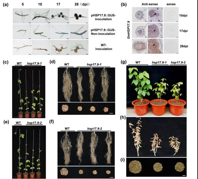GmHSP17.9调控根瘤发育及生物固氮。通过CRISPR-Cas9技术获得转基因突变体hsp17.9-1和hsp17.9-2,在相同条件下,与野生型相比,根瘤生长发育及固氮能力明显降低,进而影响了大豆产量。