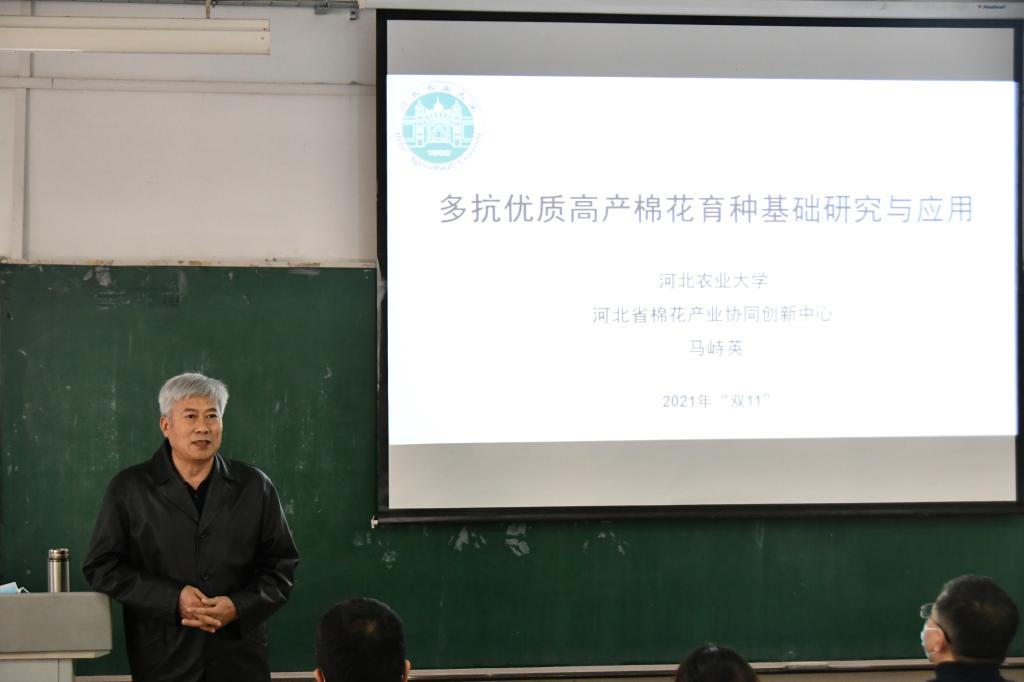 报告会上,马峙英教授从棉花产业存在的重大问题出发,以多抗优质高产棉花育种研究与应用为切入点,讲述了其在40余年研学历程中的所思所悟,所践所获。马老师指出“粮足则国稳,衣丰则民安”,棉花产业的发展具有重要的政治、经济和生态意义,保证棉花产业健康发展是事关国泰民安的大事。针对多年来病虫危害频发,旱薄盐碱地植棉大势所趋,优质原棉长期缺乏的现状,马老师带领棉花育种团队以提高品质为目标,以增强抗性为保障,从深入挖掘基因资源入手,培育了众多优质、多抗、高产的自主新品种并得到推广。
