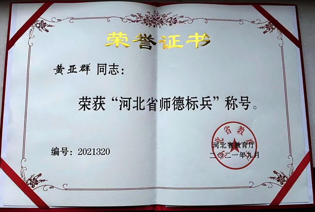 她在三尺讲台耕耘了近40载,在学生眼中她不仅学识渊博、治学严谨,同时也是道德品格、专业知识、学术水平的引路者,学生们亲切地称她为“黄奶奶”;在同事眼中,她是兢兢业业、踏踏实实、不用扬鞭自奋蹄的劳作者;在领导眼中,她是政治思想觉悟高、言行雅正、教学能力强、不计个人得失的德高老同志。她深得学生的喜爱、同事的敬佩和领导的信任。她曾获得学校首届师德先进个人、河北省师德标兵。