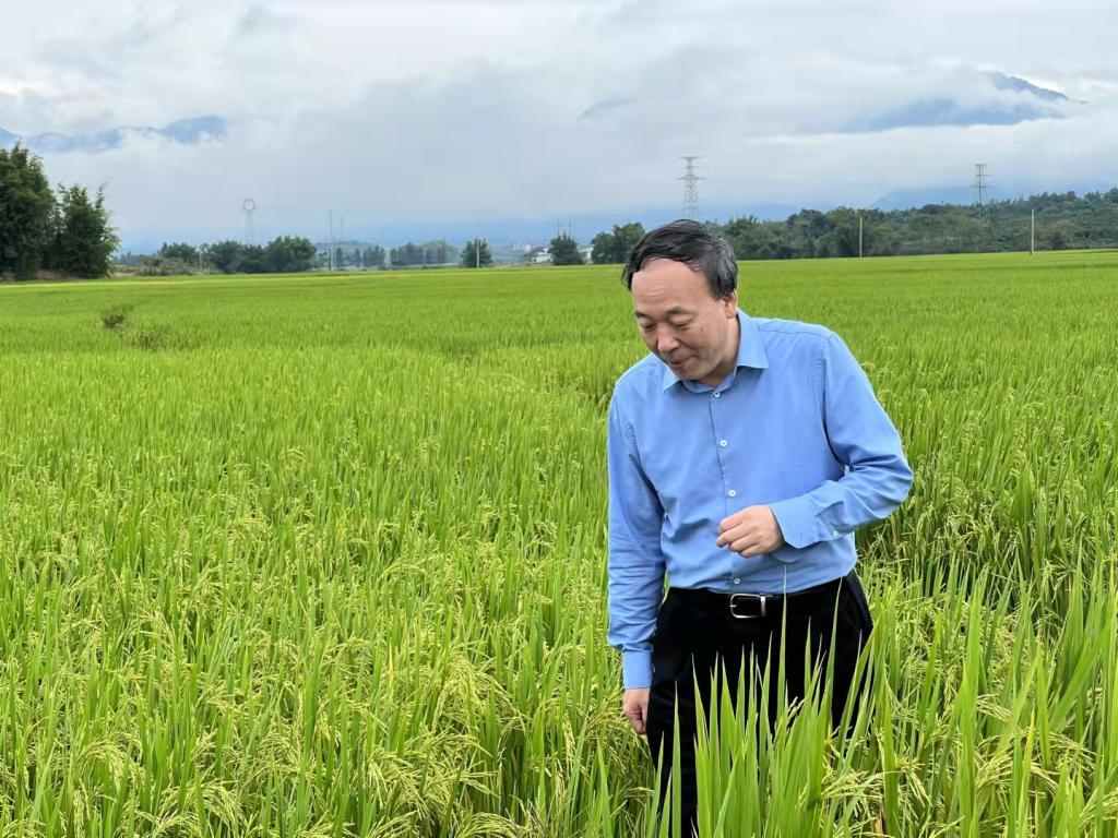 在田间查看水稻长势