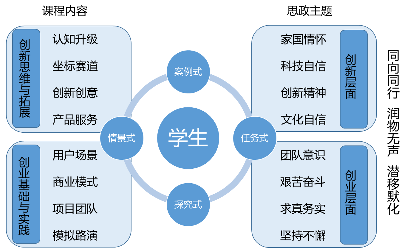 本课程以学生为中心,通过案例式、任务式、探究式、情景式教学方法,实现创新思维与拓展,创业基础与实践两大课程内容与两个层面(创新层面、创业层面)思政主题的紧密融合,两者同向同行,将思政之盐溶于课程之汤。