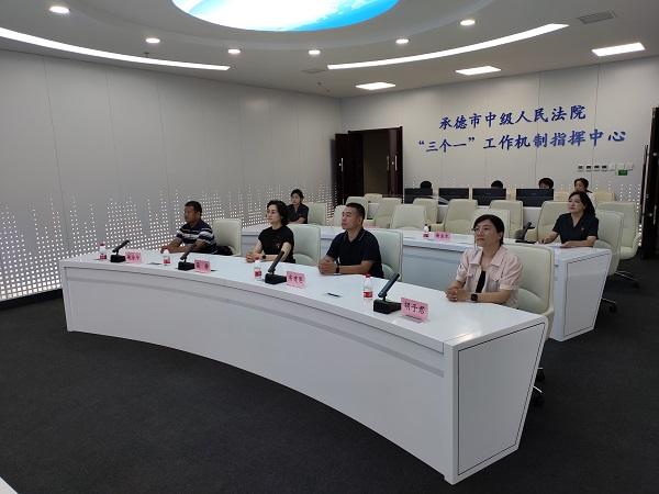 在承德市中级人民法院,在法院党组书记、院长蔺静的陪同下,房建恩一行参观了诉讼服务中心、心理咨询室、“三个一”机制指挥中心和融媒体中心,并在院长会客室进行了座谈。双方希望能够充分发挥各自优势,在人才培养、审判理论研究等方面进行资源共享,实现互利共赢。期间,朱萌博士以“农村土地流转法律问题探讨”为题,为承德中院及下辖基层法院法官、干警进行了授课和交流。