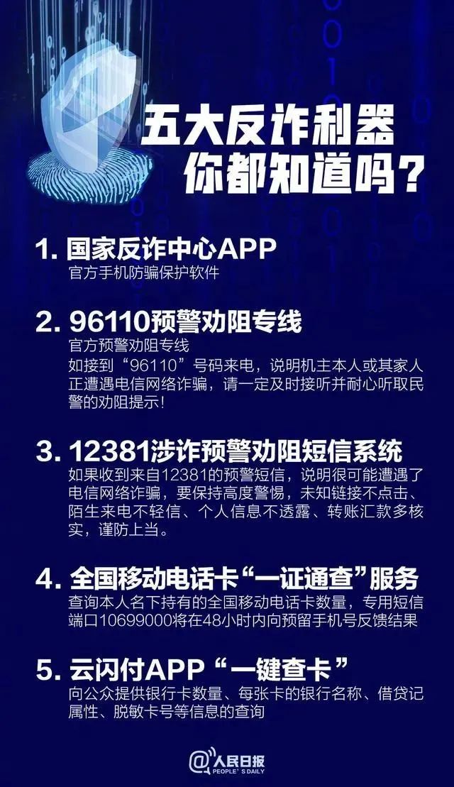 近年来,公安部、工信部、中国人民银行等部门深入推进打击治理电信网络诈骗违法犯罪,坚持打防并举、防范为先,构建推出了“五大反诈利器”——国家反诈中心APP、96110预警劝阻专线、12381涉诈预警劝阻短信系统、全国移动电话卡“一证通查”服务、云闪付APP“一键查卡”,不断加强预警防范工作,为广大群众构筑防诈反诈“防火墙”。