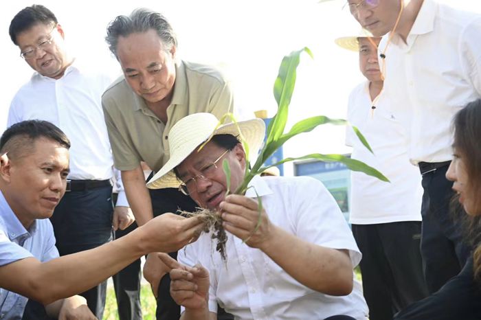今年夏收以来,河北多地持续高温少雨,对秋粮适期播种和在田作物生长造成不利影响。在旱情较重的邢台市,韩俊先后来到任泽区永福庄乡永三村澧湾农作物种植合作社、宁晋县北楼下绿色高产示范基地,实地查看玉米、大豆播种情况和作物长势,与基层干部、种粮大户和农技专家交流,在田间现场挖取土壤,仔细查看墒情、土壤团粒结构和玉米苗根系生长状况,详细了解当地抗旱用水保障情况,与农民细算粮食产量账、成本账、收益账。得知河北农业农村部门采取多种措施保播保苗,夏播已基本完成,田间作物长势总体良好,韩俊予以肯定。他强调,秋粮是全年粮食的大头,当前,黄淮海持续高温少雨,部分地区旱情较重,各级农业农村部门务必牢固树立抗灾夺丰收思想,密切跟踪监测天气变化、作物长势等,第一时间掌握旱情、墒情、苗情,因地制宜统筹调配水源,用好地表水灌溉、机井浇灌和人工增雨等,保障农业灌溉用水需要,全力确保种足种满、苗齐苗全。现在已进入主汛期,局地有旱涝急转风险,要提前做好预案,储备好物资力量,及时有效防灾减灾救灾。