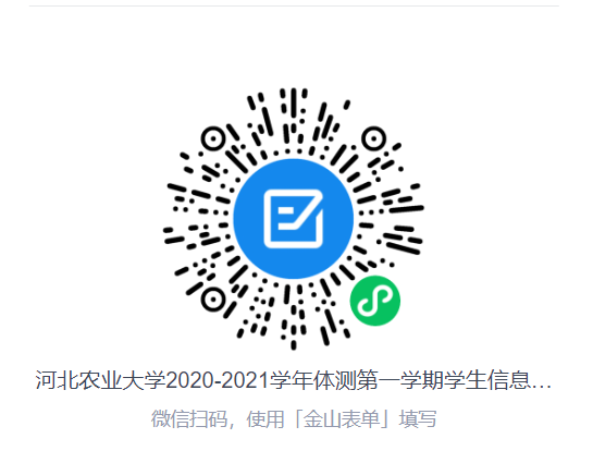 3.3表单填报说明: 3.3.1学号(请认真核对确认无误,两端不能有空格) 3.3.2视力数据标准,执行《中华人民共和国标准对数视力表》,请按实际情况填写。 3.3.2.1左/右裸眼视力:录入范围为3.0–5.3之间,如裸眼视力低于3.0以“0”代替。 3.3.2.2串镜检查说明:串镜是验光时戴的插片眼镜;视力小于5.0需要戴串镜矫正,大于5.0则不需要;1代表远视眼,远视度数多;-1代表近视眼,近视度数多。 3.3.2.3左/右眼屈光不正:以“0”代表正常,以“1”代表近视,以“2”代表远视,以“3”代表其他(疾病等其他原因),如条件不允许,未测试者录入“9”。 3.3.3提交表单后,可再次编缉填报内容。 3.3.4填报中出现微信或QQ提示打开表单失败,可换其他浏览器,手机或电脑平台均可 3.4截止时间: 学生信息收集截止:2020年9月18日下午6点 3.5填报中如有表单问题,请汇总至本学院体育部长,由体育部长统一向体育工作部反映解决。 四、测试安排工作 东校区:9月19日发放东校区有课时间统计表 9月21日18点前收回有课时间统计表 9月23日发布东校区测试安排 西校区:9月28日发放西校区有课时间统计表 10月5日18点前收回有课时间统计表 9月7日发布西校区测试安排 各院在体育工作部网站(http://tigongbu.hebau.edu.cn/portal.php)于发放《有课时间统计表》时间,下载并填写各院“2020-2021-1学期有课时间统计表-xx院-西(东)校区.xlsx”,在有课时间段填写“有课”或“实习”,规定时间内以院为单位发送到282070126@qq.com. 五、测试耗材购买事项 肺活量吹嘴大一新生免费发放一次(请妥善保管使用四年),其他年级同学不再提供,请各院提醒学生自行携带。(据个人了解,西校区宜家旺超市,东校区西门口依然商贸都有售卖,学生吹嘴丢失者可提前自行采购) 六、免测学生登记办法 学生因重大疾病、伤残、运动功能障碍等原因,需办理免测登记,按如下步骤进行: 第一步:学生可在手机、平板或电脑平台打开https://f.wps.cn/form-write/ocnwnZaJ/,申报免测,也可使用微信扫码打开小程序完成申请。(东校区申请截止时间:9月25日;西校区申请截止时间:10月16日)