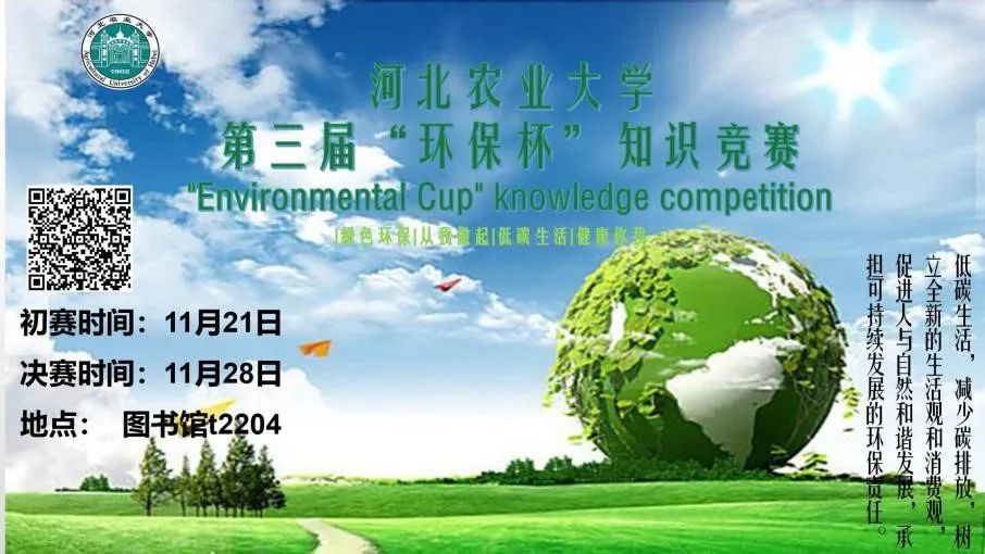 为提升大学生环保意识, 展现新时代青年的环保担当与青春风采,校团委社团管理部、“蓝色天使”环境保护协会、太行之子协会、“燕赵情”三农社和爱心社共同开展了以“环保知多少,文明我先行”为主题的环保知识竞赛活动。贯彻环保教育,宣导环保咨询,我校学子踊跃报名参与“环保杯”知识竞赛活动。