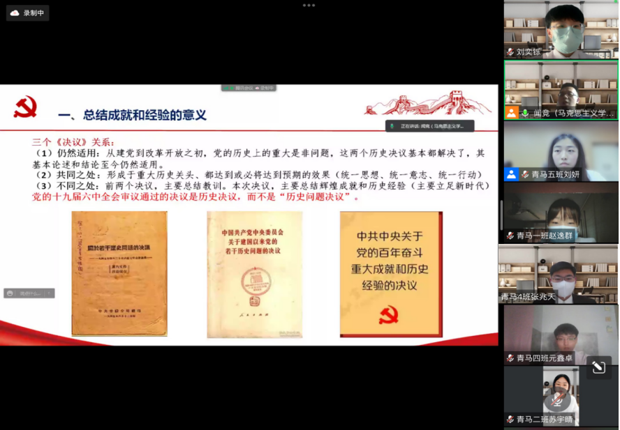 4月21日下午,我校 “青马工程”学生骨干培训班春季班通过线上会议的形式举行。马克思主义学院闻竞老师以“党的百年奋斗重大成就和历史经验”为题,为校级“青马工程”培训班的学生骨干作精彩报告,青马学员150余人参加讲座。