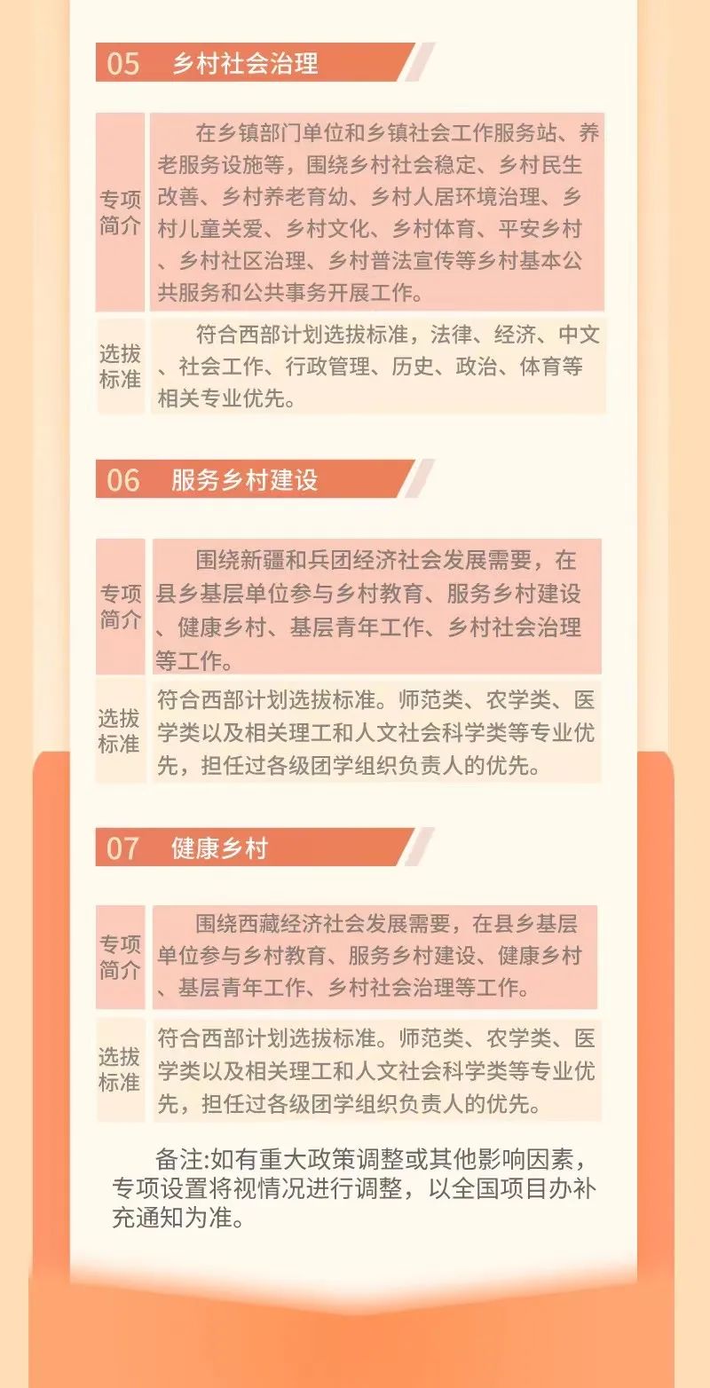 实施乡村教育、服务乡村建设、健康乡村、基层青年工作、乡村社会治理、服务新疆、服务西藏七个专项。