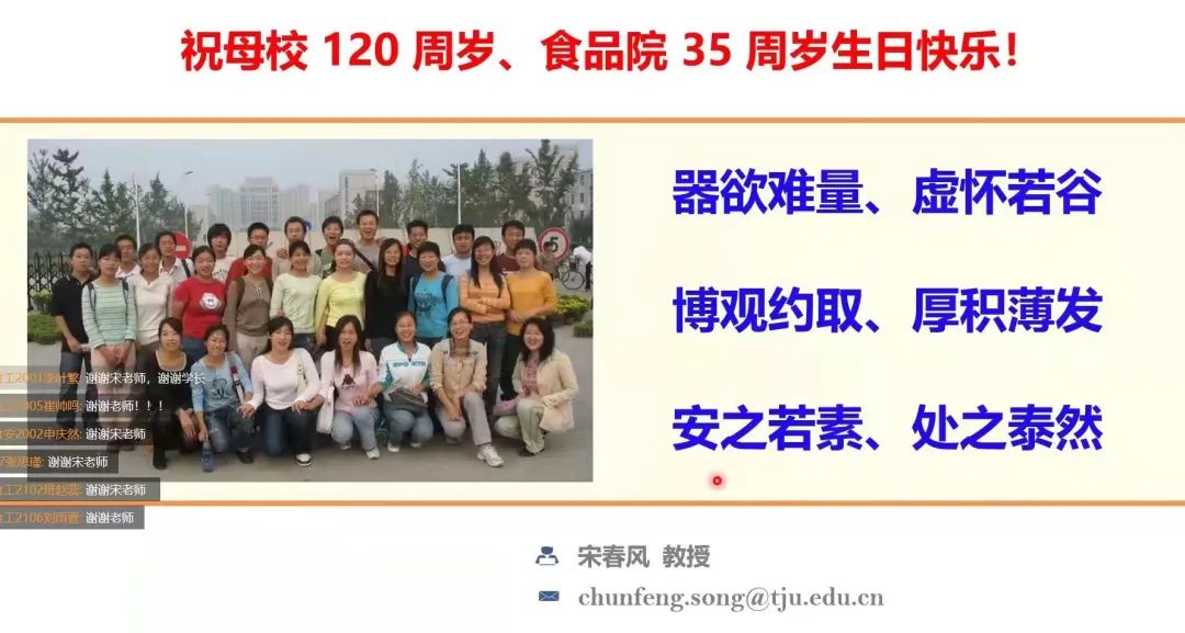 5月12日,第一百四十一期“出彩人生大讲堂”120周年校庆特别版顺利举行。由校团委主办,食品科技学院承办。邀请2008届毕业生天津大学环境学院教授宋春风以“年华似水、岁月如歌——争做不负韶华的农大人”为题为同学们做分享,本次活动共300余位师生代表观看直播并进行线上讨论与分享。